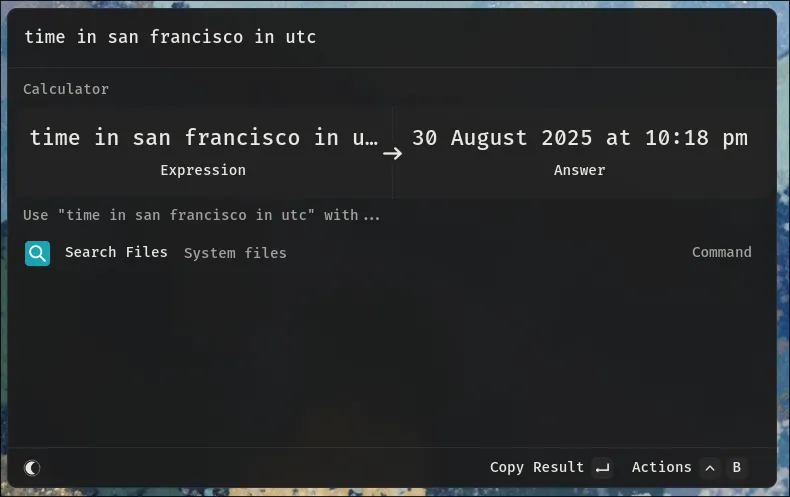 Vicinae is able to integrate with many different calculator backends to provide you with the ability to do maths using natural language from within the launcher. Most backends support quality of life stuff such as currency or unit conversions.