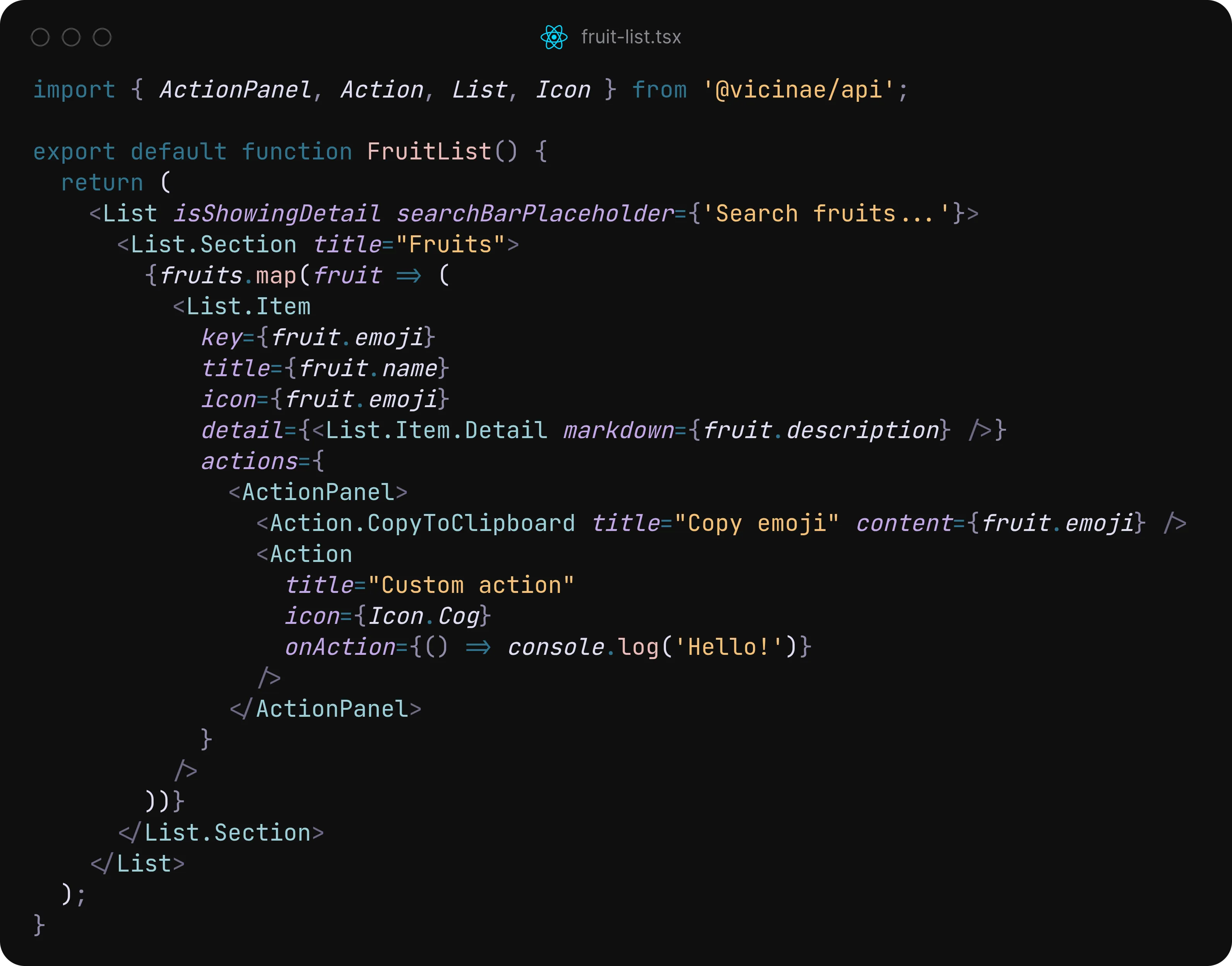 Vicinae is typically extended using its React/TypeScript API, which allows you to focus on your extension while offloading all the complex UI rendering to the C++ core.