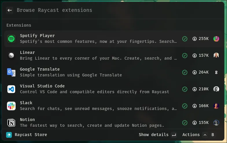 For now we don't provide a centralized store to discover extensions, except for the Raycast ones (see below) where we use the official Raycast store.